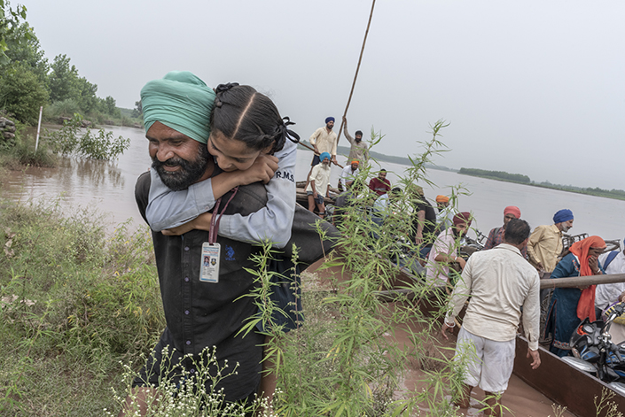 Sanamdeep Kaur, 13, arrives from a boat crossing the last bit on her father’s back because of the high water levels in the Ravi river in Makaura, India, July 29, 2022. Makaura Pattan is located across the Ravi river. While one side of the cluster is surrounded by the Ravi river, the other side is the fencing of the international border with Pakistan. This unusual geography puts it in an usual situation depriving it of access to basic necessities.